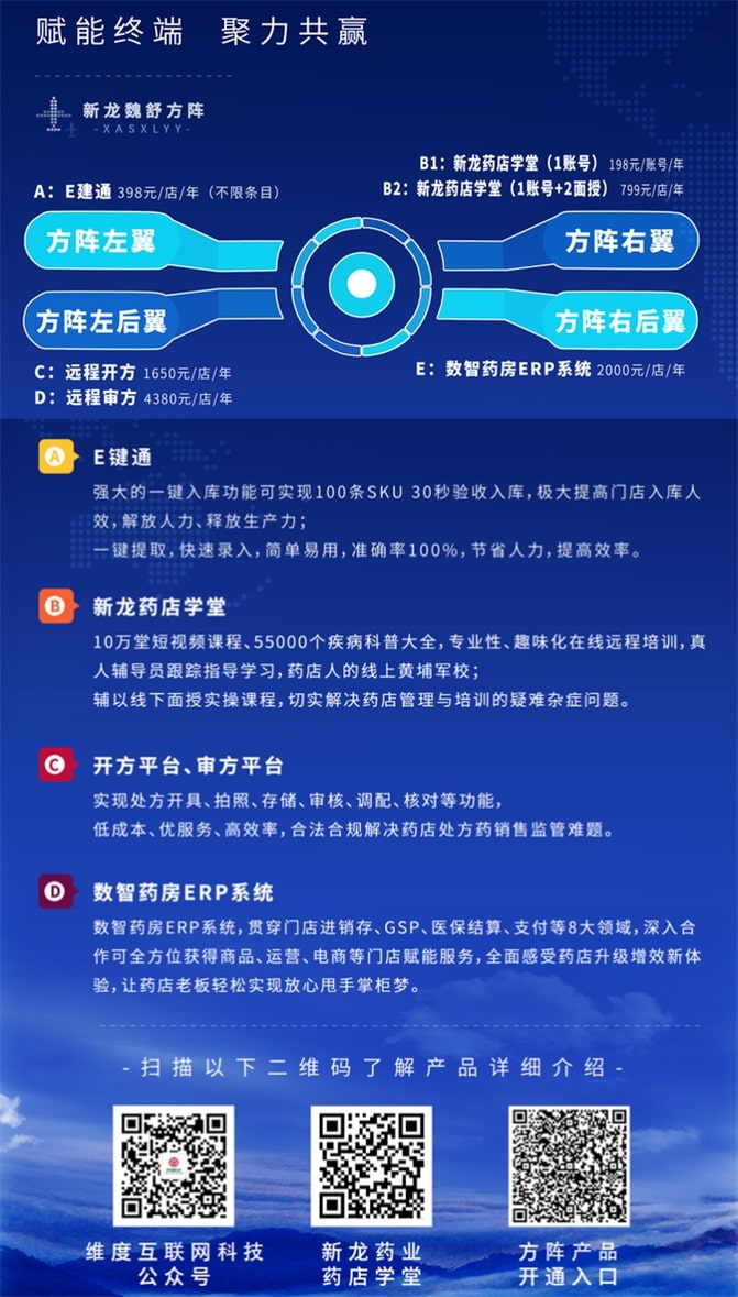 编组战队包含:新龙云商在线购药商城、新龙药业百人销售大军、新龙药业万平智能仓配中心、E建通(一键入库)、在线开放平台、审方平台、数智药房ERP系统等产品。合法、合规、全方位解决医药零售行业各种经营、管理难题,助推零售终端先人一步完成迭代升级。